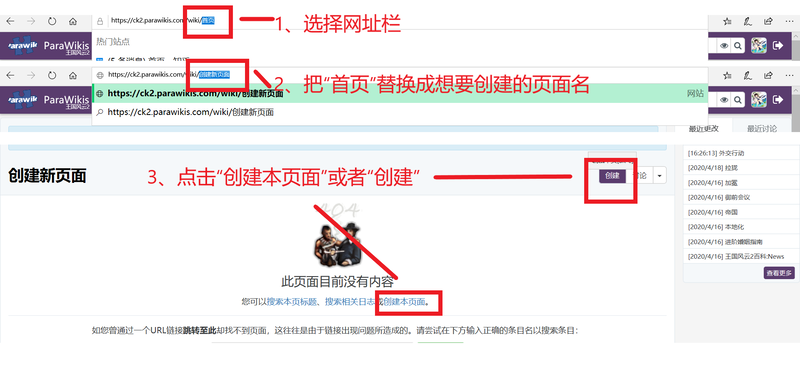 可以通过直接在地址栏修改地址,来访问这个尚无内容的新页面,并写作内容、创建页面: