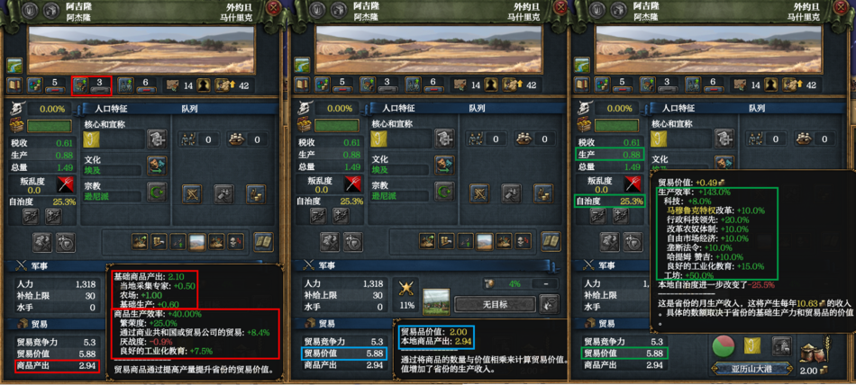商品产出可以透過建造工廠或提高省份的基础产值來增加(每點产值增加